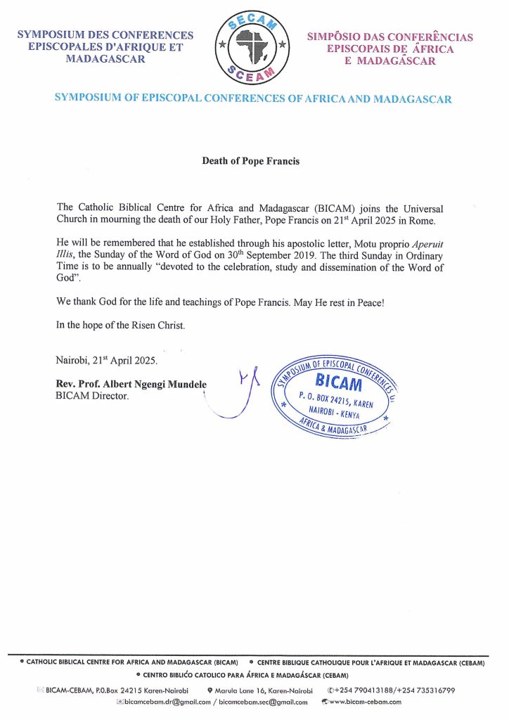 The Catholic Biblical Centre for Africa and Madagascar (BICAM) is the official organ of SECAM for the promotion, coordination and organization of the Biblical Apostolate and Bible Translations in African languages.